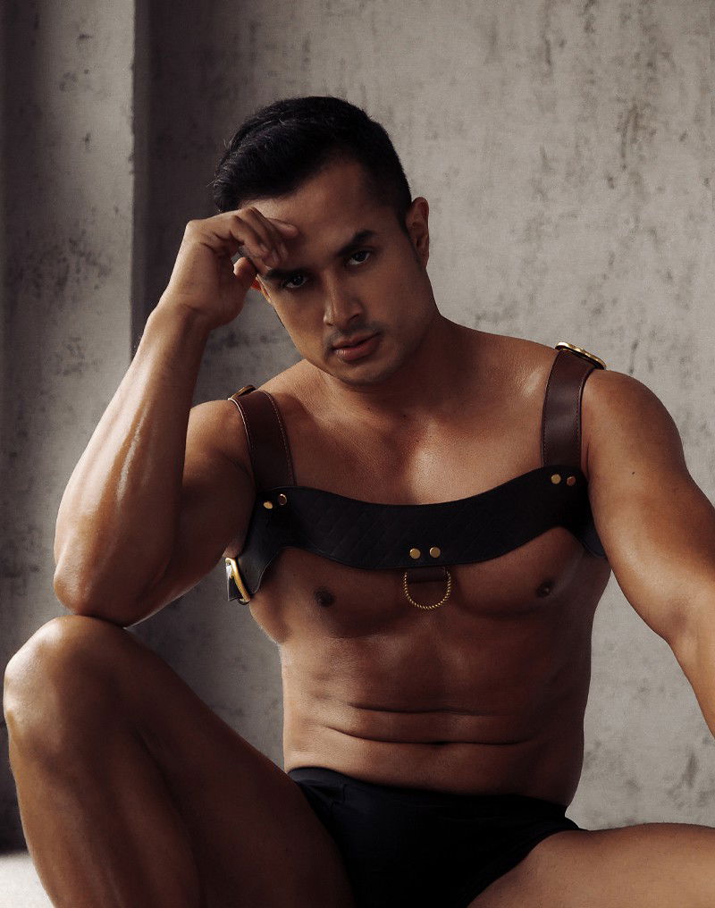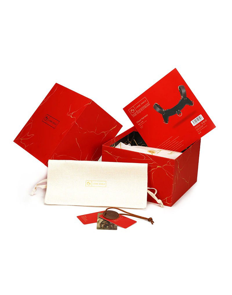 Luxe leren borstharnas van echt rundleer met lamsleer voering. Verstelbaar 87-112cm. Verkrijgbaar in zwart, bruin en goud accenten.