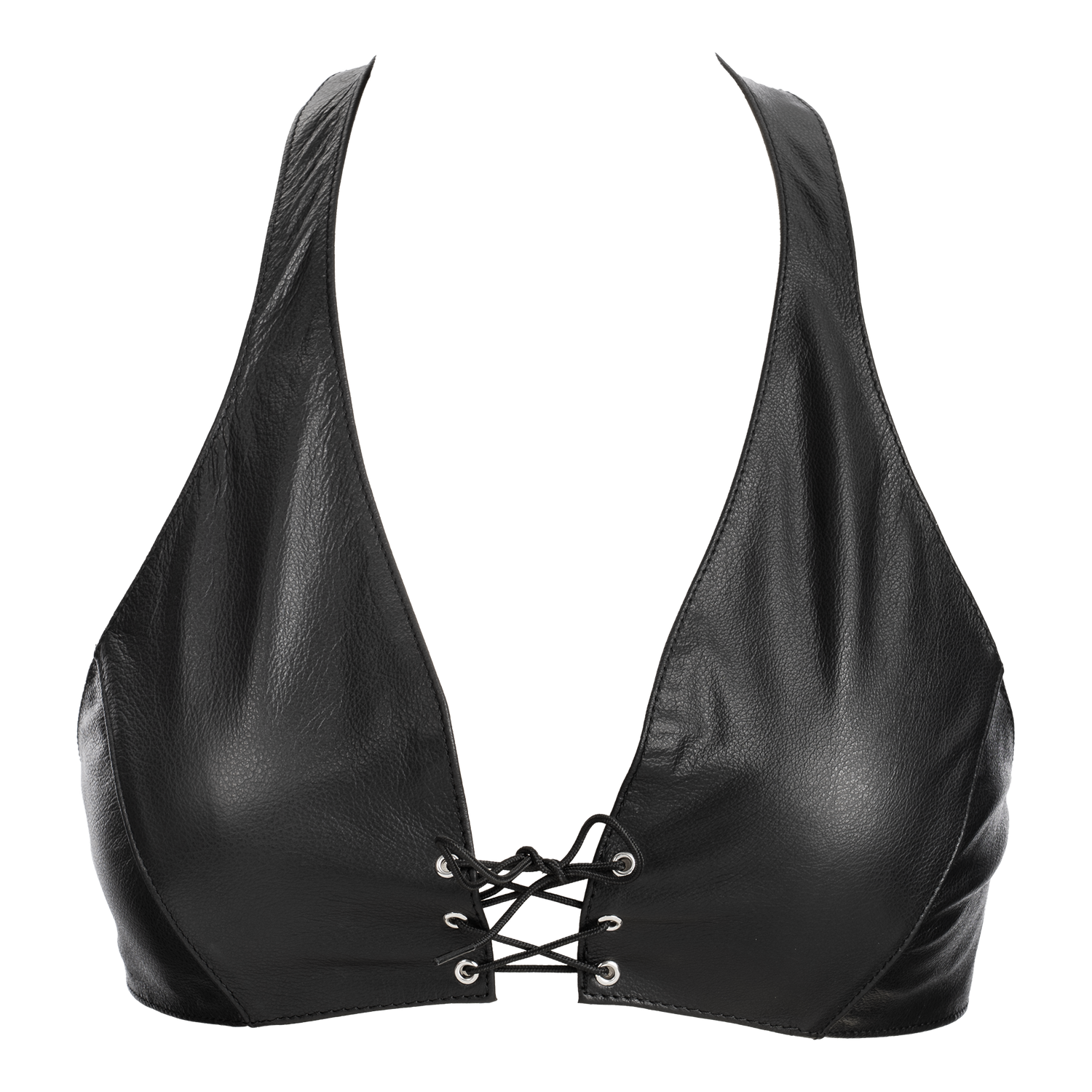 Handgemaakte lederen bustier van echt nappaleder. Verstelbaar met drukknoopsluiting in nek en vetersluiting voorkant. Verkrijgbaar in S, M, L.