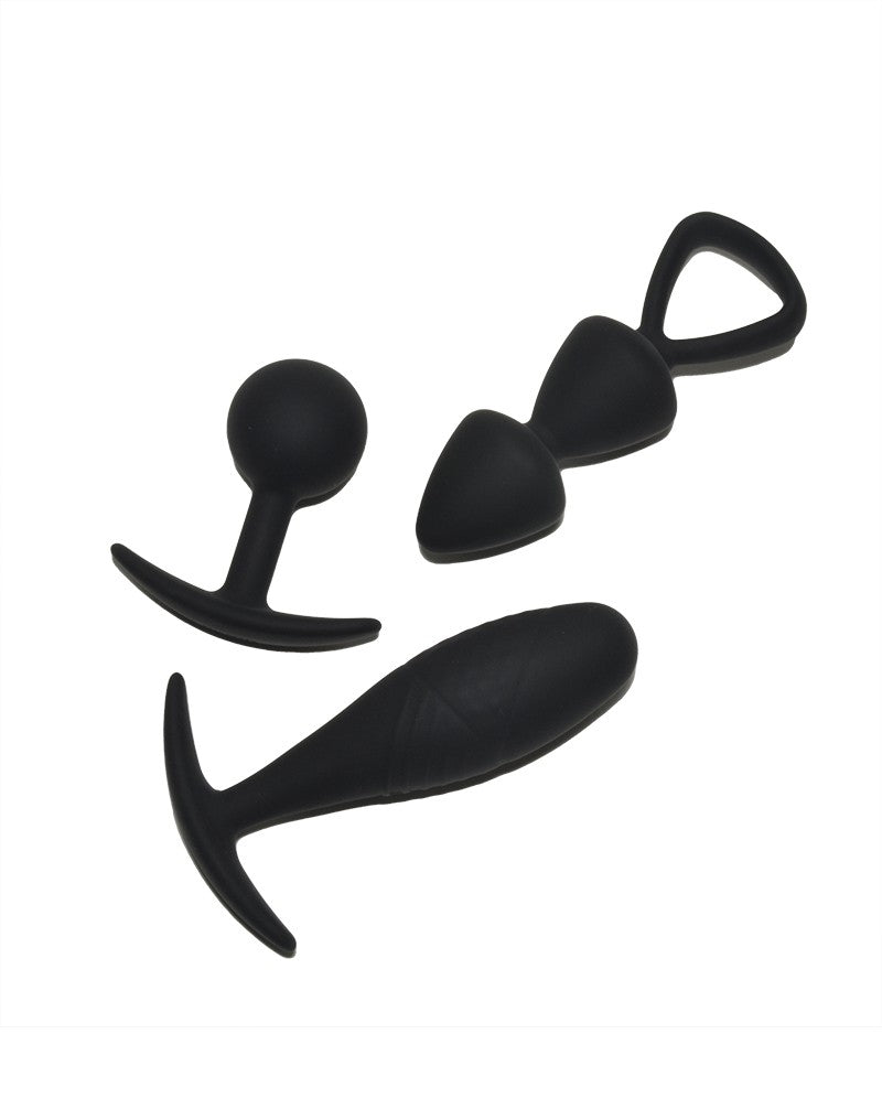 Set van 3 buttplugs in maat S van medische siliconen. Ergonomische handgrepen voor veilig gebruik. Waterbestendig en makkelijk schoon te maken.
