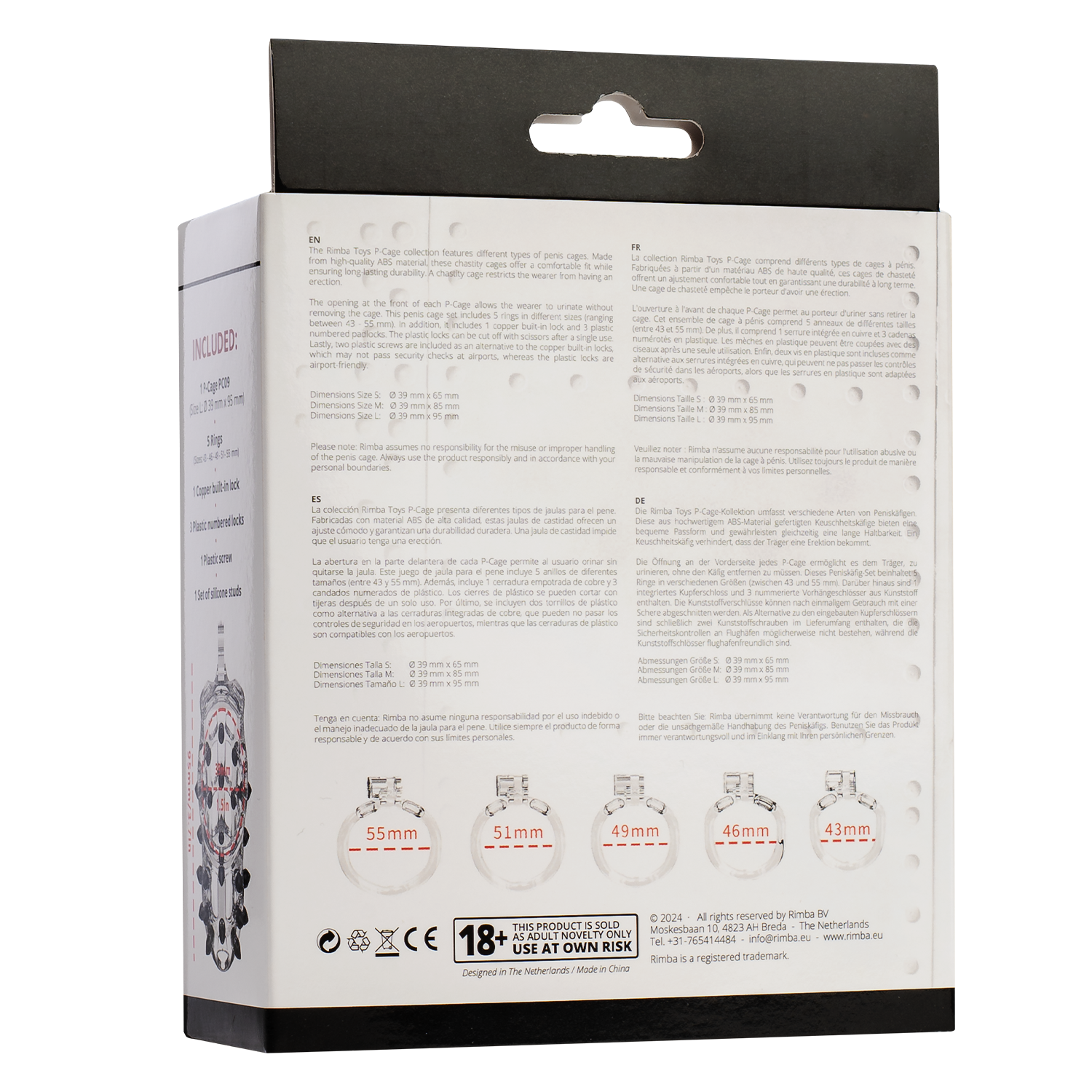 De Rimba P-Cage collectie bestaat uit verschillende soorten peniskooien. Gemaakt van ABS-materiaal van hoge kwaliteit, bieden deze kuisheidskooien een comfortabele pasvorm en een lange duurzaamheid. Een kuisheidskooi weerhoudt de drager van een erectie. Door de opening aan de voorkant van elke P-Cage kan de drager plassen zonder de kooi te verwijderen. Deze peniskooi set bevat 5 ringen in verschillende maten (variërend tussen 43 - 55 mm). Daarnaast bevat het 1 koperen inbouwslot en 3 plastic genummerde hangsloten. De plastic slotjes kunnen na eenmalig gebruik worden afgeknipt met een schaar. Tot slot wordt er een plastic schroef meegeleverd als alternatief voor het koperen ingebouwde slot, dat mogelijk niet door de veiligheidscontroles op luchthavens komt, terwijl het plastic slot luchthavenvriendelijk is.
