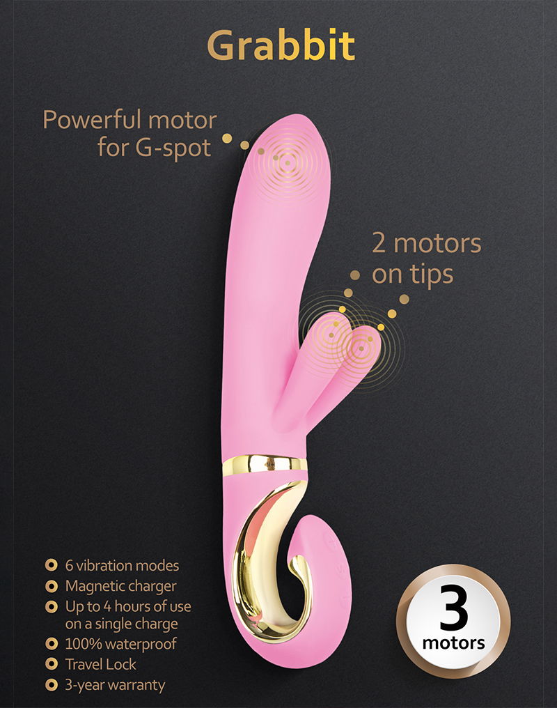 Werkt op 3 krachtige motoren, waarvan er een in de top aan de punt zit, om de G-spot te stimuleren, en twee motoren bevinden zich in kleine oren om de clitoris te stimuleren. De gebruiksduur van de Grabbit is niet minder dan 4 uur na het opladen.