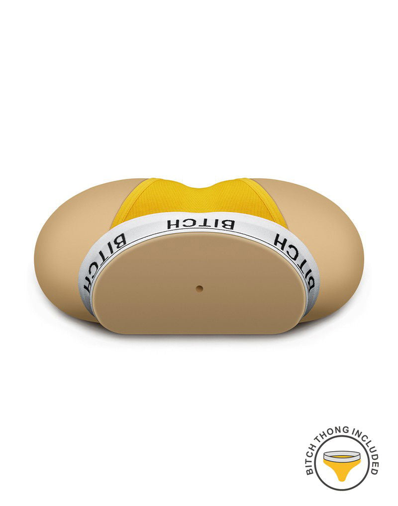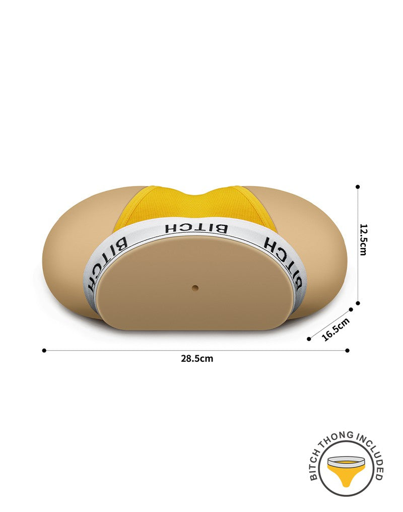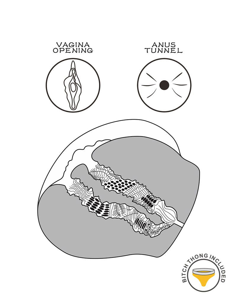 Deze masturbator is gemaakt van realistisch, huidvriendelijk materiaal dat het vrouwelijk lichaam nabootst en zorgt voor een uiterst realistische ervaring. De ontworpen vaginale tunnel heeft getextureerde binnenkant dat duidelijk voelbaar is bij het inbrengen van de penis. Inbegrepen is een gele "bitch"-string. De string kan ook van de masturbator worden verwijderd.