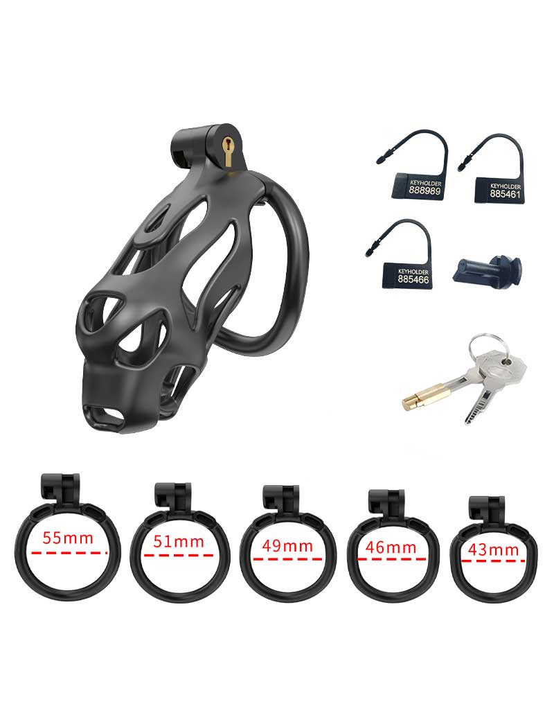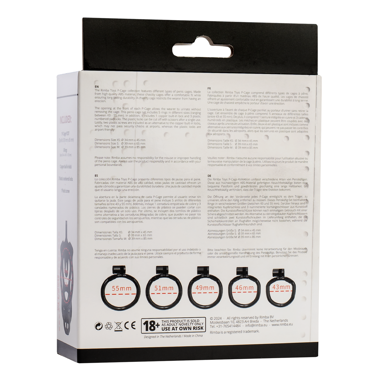 De Rimba P-Cage collectie bestaat uit verschillende soorten peniskooien. Deze kuisheidskooien zijn gemaakt van ABS-materiaal van hoge kwaliteit en bieden een comfortabele pasvorm met een lange levensduur. Een kuisheidskooi weerhoudt de drager van een erectie. Door de opening aan de voorkant van elke P-Cage kan de drager plassen zonder de kooi te verwijderen. Deze peniskooi set bevat 5 ringen in verschillende maten (variërend tussen 43 - 55 mm). Daarnaast bevat het 1 koperen inbouwslot en 3 plastic genummerde hangsloten. De plastic slotjes kunnen na eenmalig gebruik worden afgeknipt met een schaar. Tot slot wordt er een plastic schroef meegeleverd als alternatief voor het koperen ingebouwde slot, dat mogelijk niet door de veiligheidscontroles op luchthavens komt, terwijl het plastic slot luchthavenvriendelijk is.