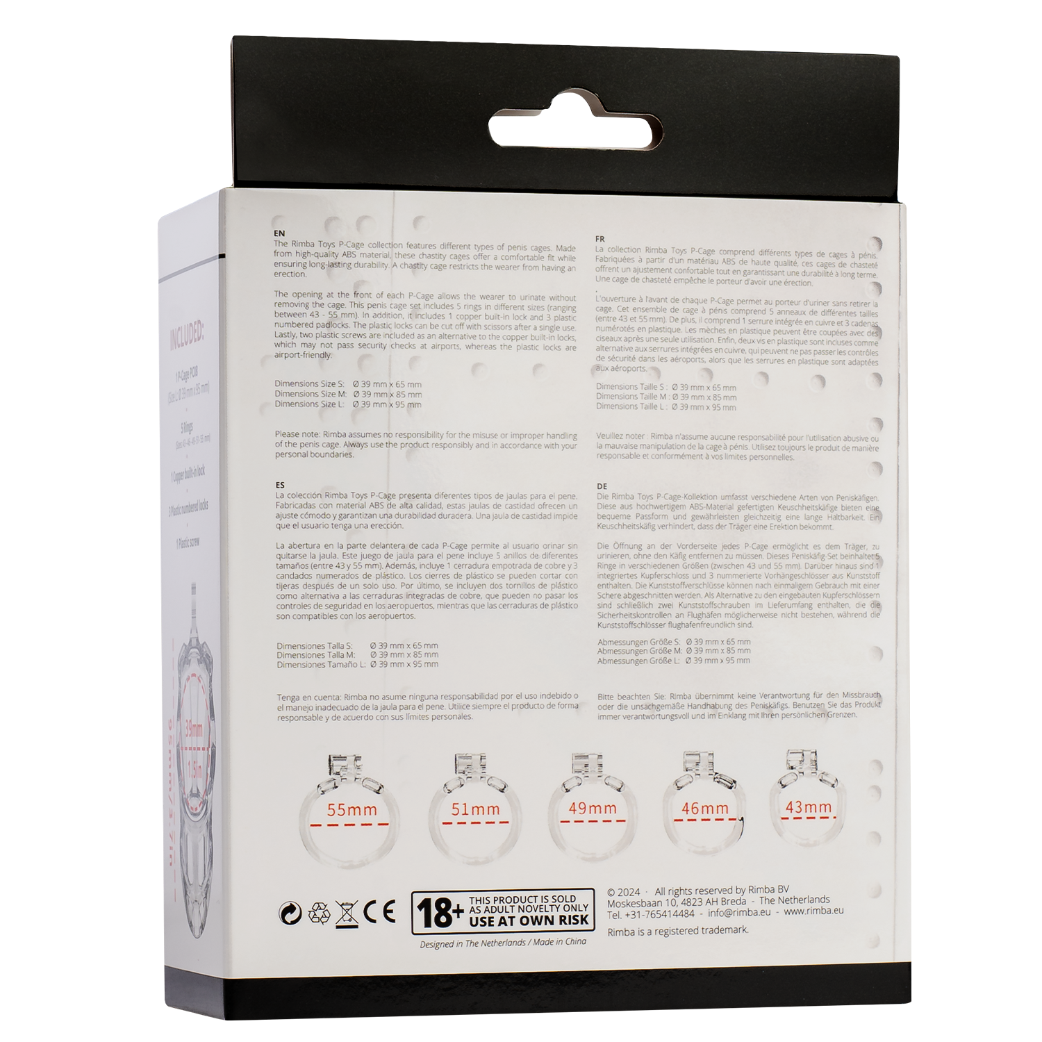 De Rimba P-Cage collectie bestaat uit verschillende soorten peniskooien. Deze kuisheidskooien zijn gemaakt van ABS-materiaal van hoge kwaliteit en bieden een comfortabele pasvorm met een lange levensduur. Een kuisheidskooi weerhoudt de drager ervan een erectie te krijgen. Door de opening aan de voorkant van elke P-Cage kan de drager plassen zonder de kooi te verwijderen. Deze peniskooi set bevat 5 ringen in verschillende maten (variërend tussen 43 - 55 mm). Daarnaast bevat het 1 koperen inbouwslot en 3 plastic genummerde hangsloten. De plastic slotjes kunnen na eenmalig gebruik worden afgeknipt met een schaar. Tot slot wordt er een plastic schroef meegeleverd als alternatief voor het koperen ingebouwde slot, dat mogelijk niet door de veiligheidscontroles op luchthavens komt, terwijl het plastic slot luchthavenvriendelijk is.