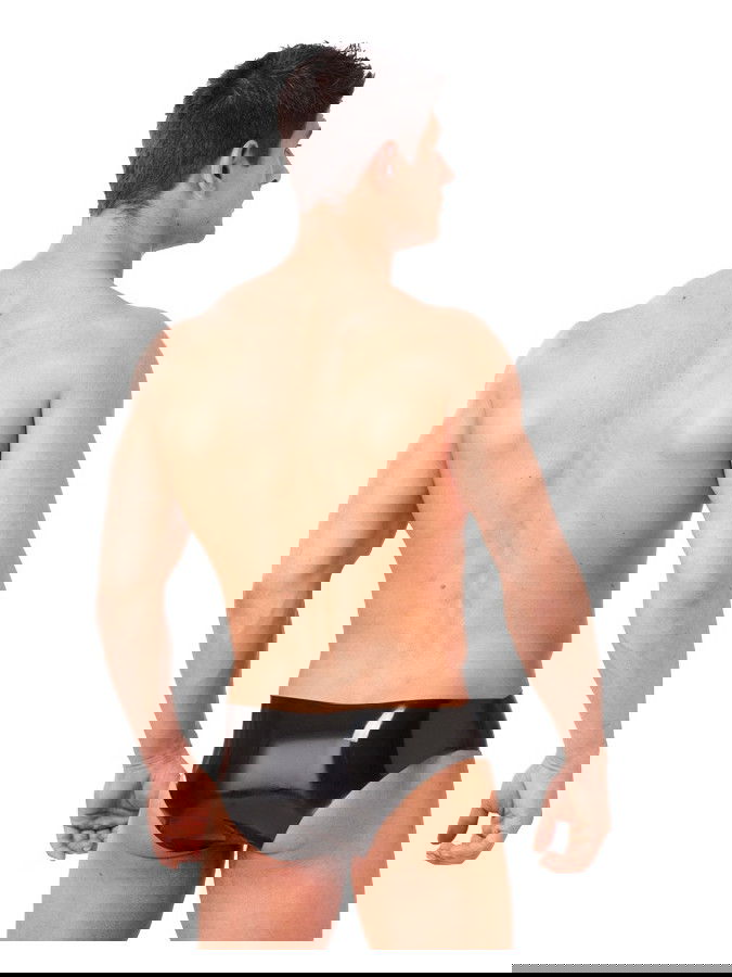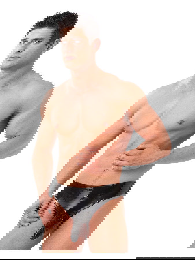Latex herenslip met geïntegreerde penis sleeve. 600% rekgarantie voor perfecte pasvorm. Sleeve: 130mm lang, 45mm diameter.