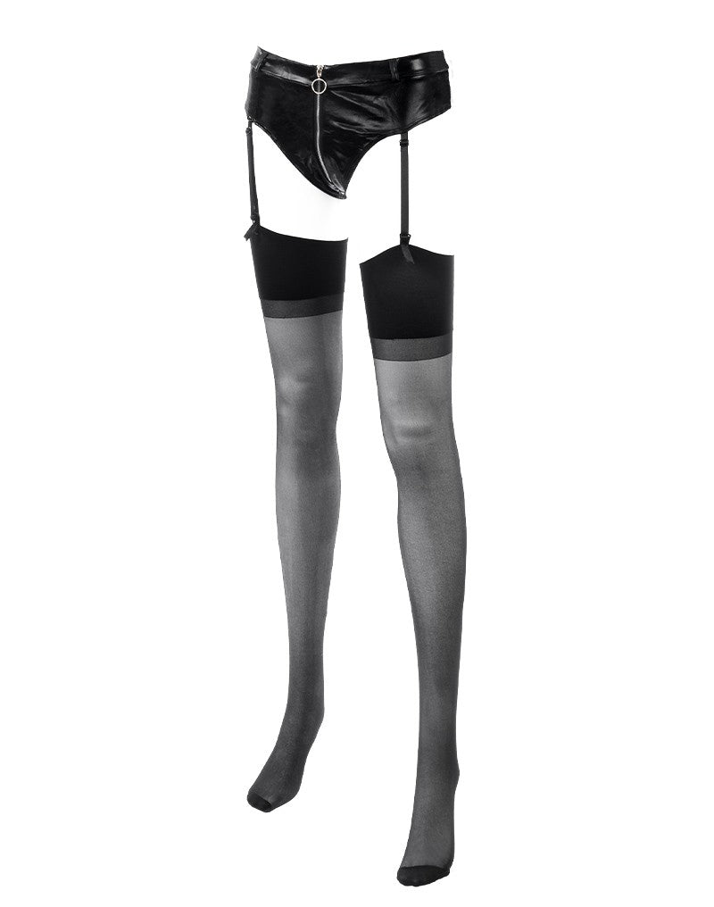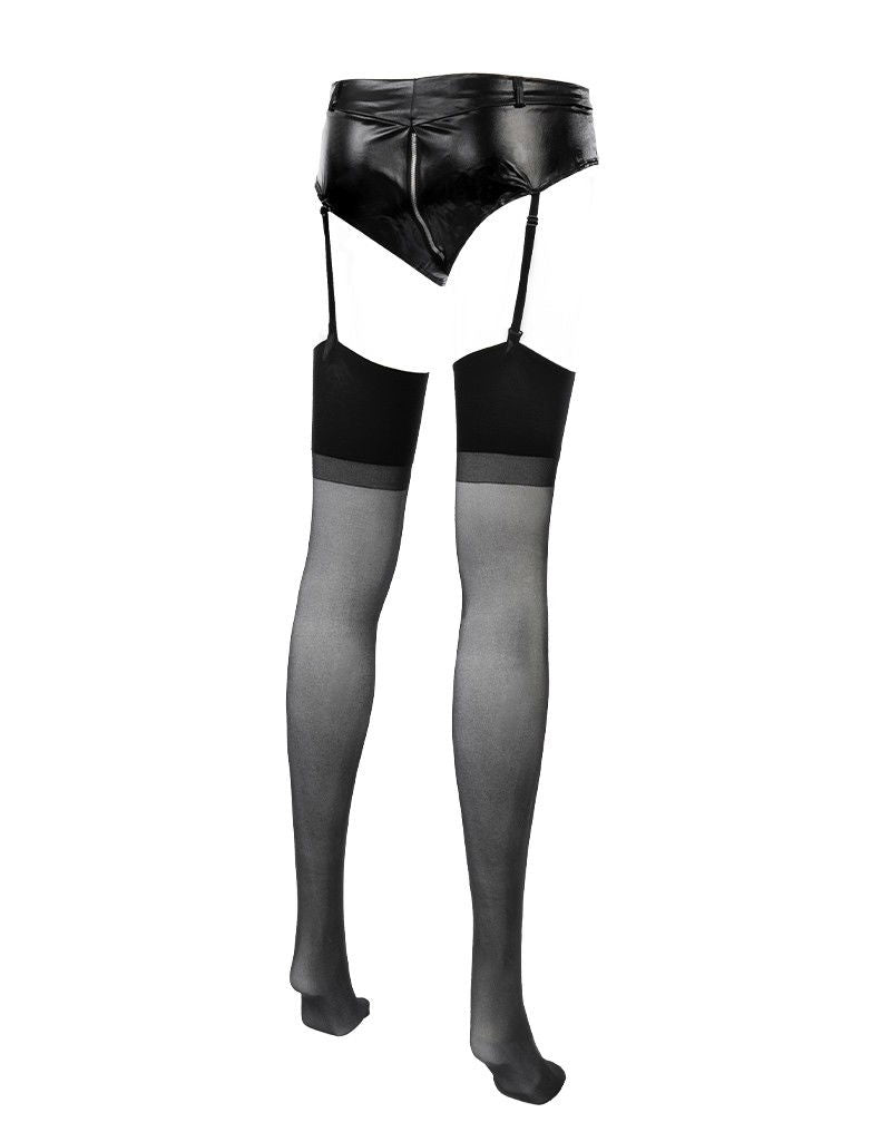 Wetlook hotpants met ritssluiting en bijpassende kousen. Complete set van elastisch polyester. Sexy jarretels voor ultieme verleiding.