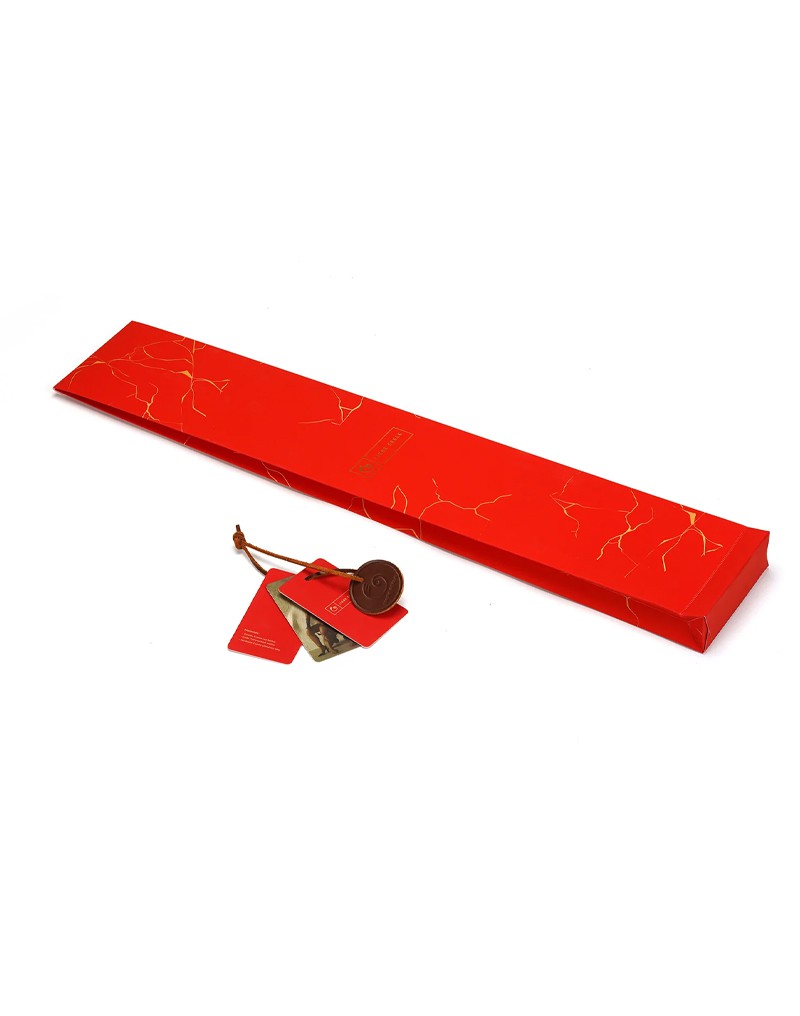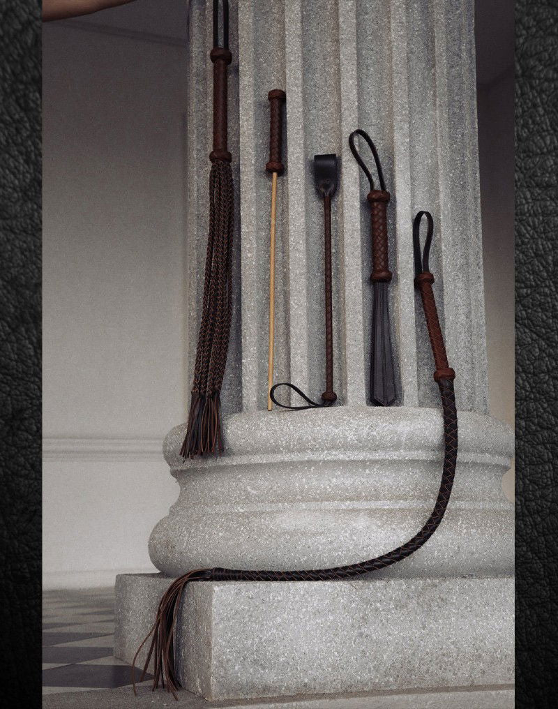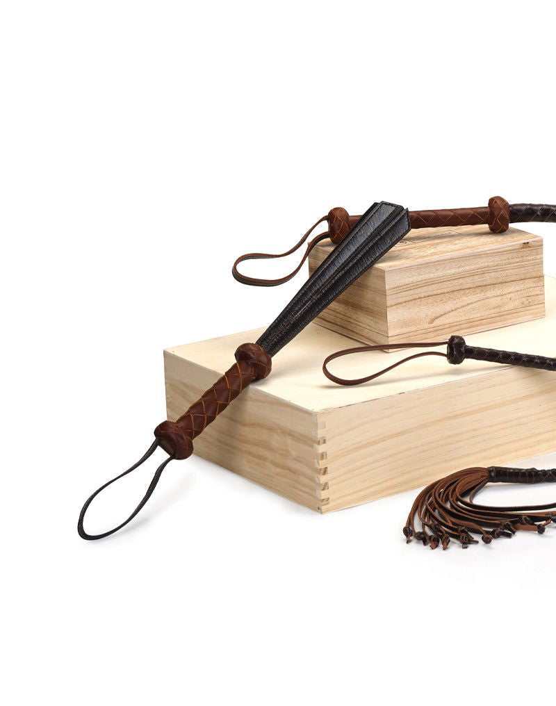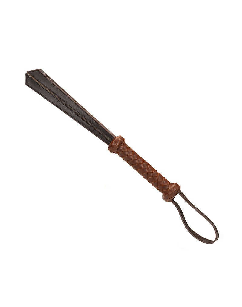 De spanking slapper is gemaakt van een houten handvat omwikkeld met hand gevlochten echt rundleer op maat en vier dubbel gelaagde leren planken. De slapper heeft een totale lengte van 53.5 cm. Het handvat van de slapper is 17 cm en de polsband heeft een diameter van 13 cm.