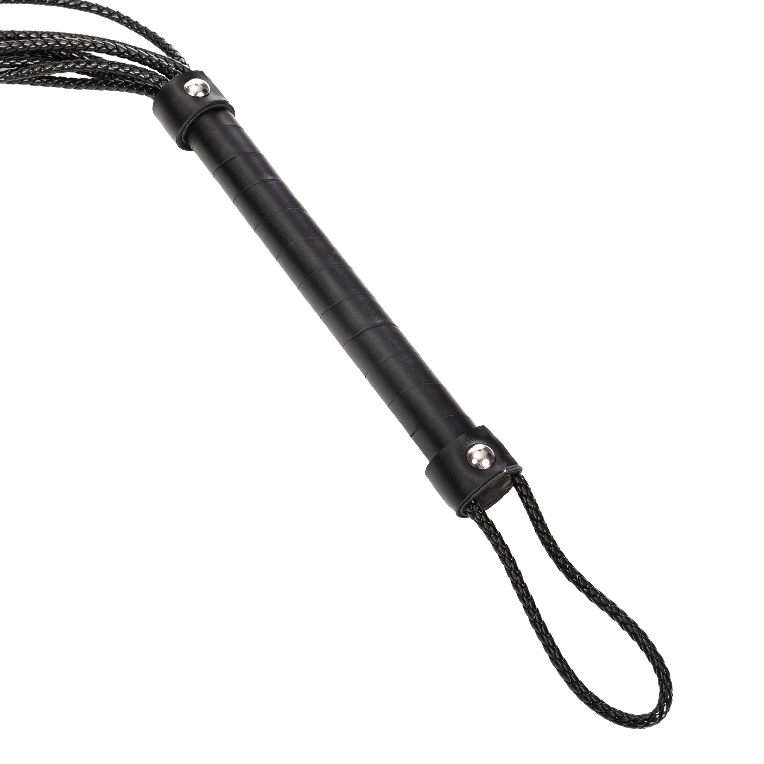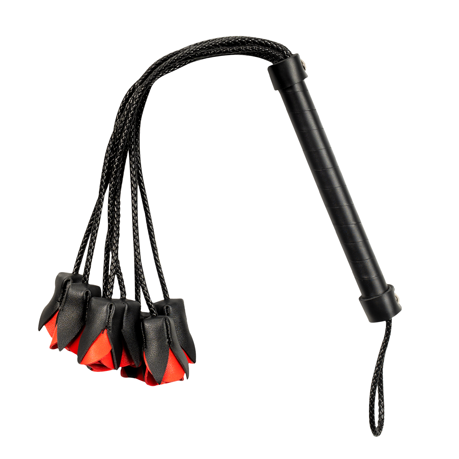 De diepzwarte basis en vurige rode rozen maken deze zweep een echte blikvanger in elke speelse setting.