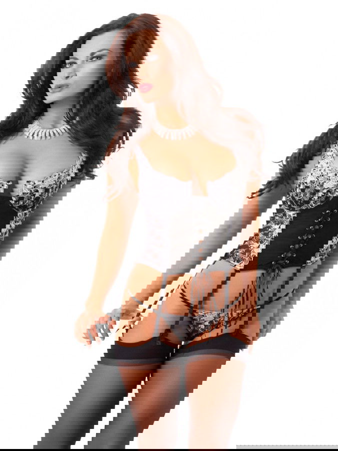 Chique corset set in zwart met wit geborduurd. Deze set bestaat uit een corset, G-string en kousen. Het corset heeft haakjes aan de achterkant om te sluiten.