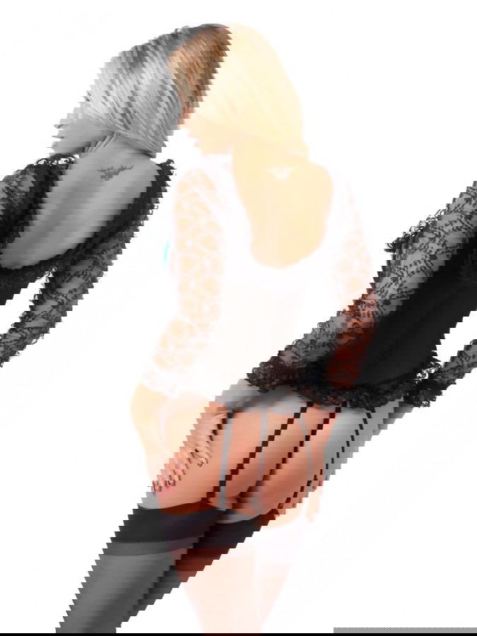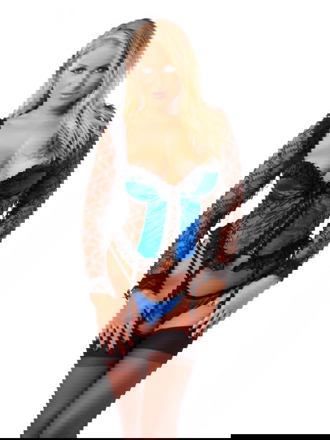 Elegant korset met beugels, G-string en kousen. Handige haakjes sluiting aan voorkant. Polyamide materiaal in zwart/blauw kleurcombinatie.