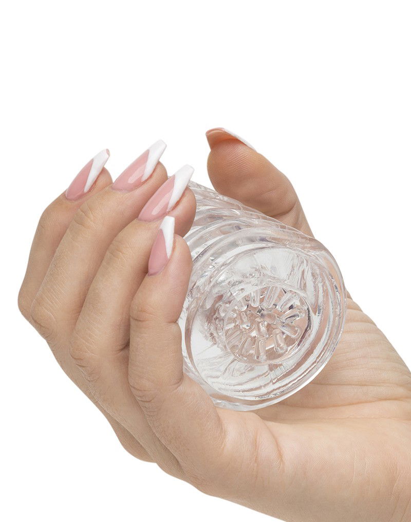 - · Een omkeerbare handheld stroker voor hem, met stimulerende ribben aan de ene kant en prikkelende ticklers aan de andere