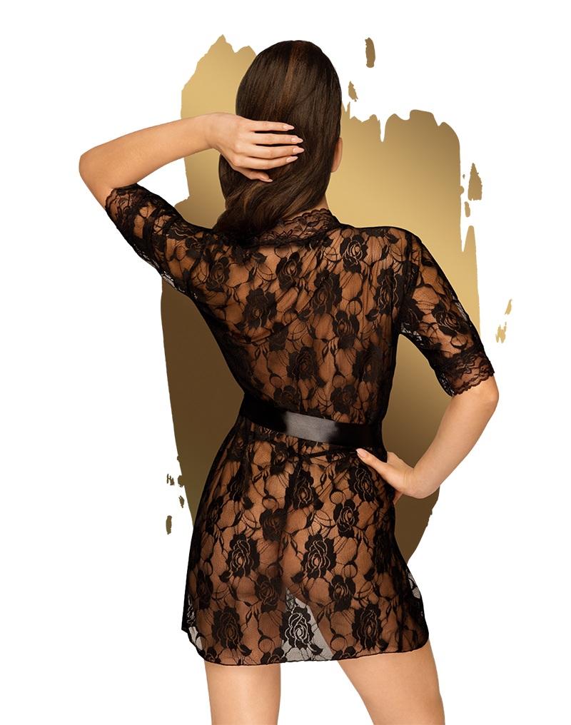 Elegante kanten kimono met romantisch bloemenmotief. Inclusief bijpassende string. Satijnen riempje voor perfecte pasvorm.