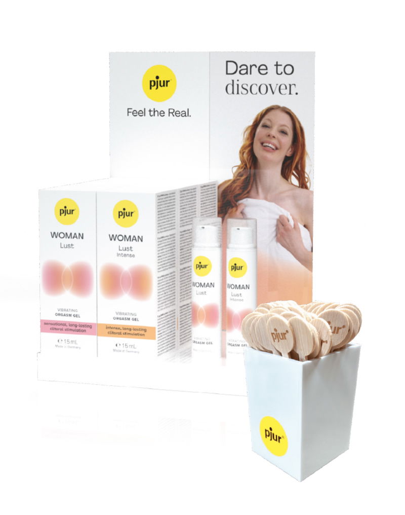 Houten stokjes die gebruikt kunnen worden door klanten om de Pjur Lube te testen, bijvoorbeeld Pjur Woman Lust en Pjur Woman Lust Intense.