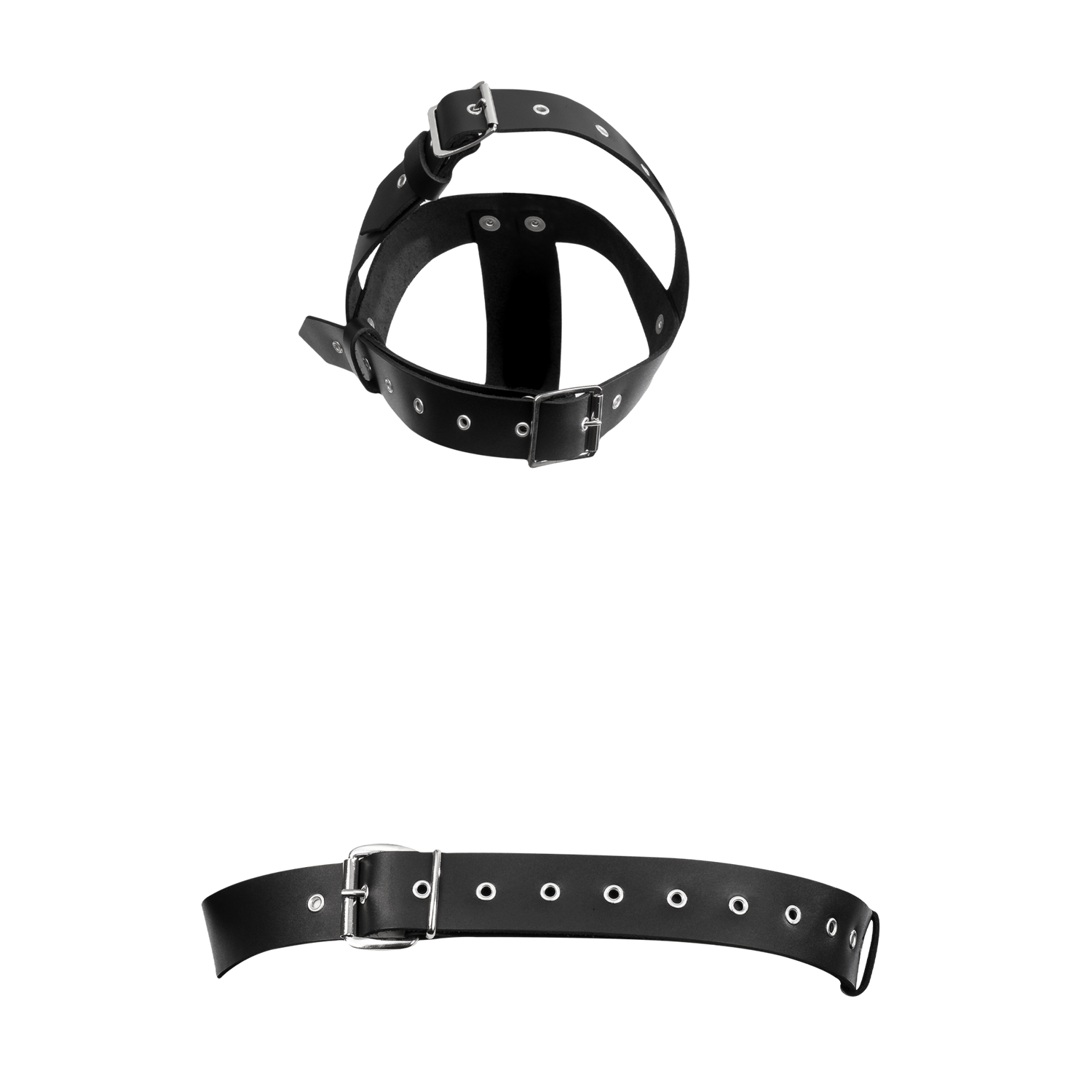 Het hoofdharnas heeft zowel een band rond het voorhoofd als rond de kin.