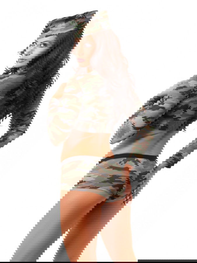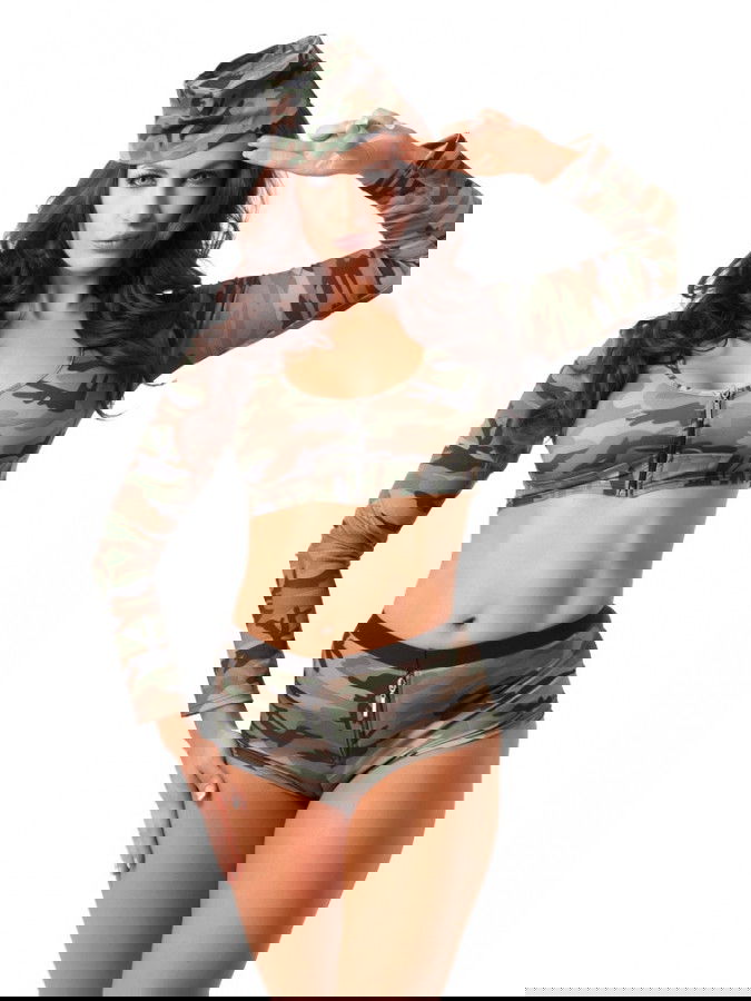 Camouflage soldatenuniform bestaande uit 3 delen. Een pet, een topje met lange mouwen en ritsluiting aan de voorzijde en een sexy hotpants met ritssluiting. Amorable is sexy lingerie by Rimba