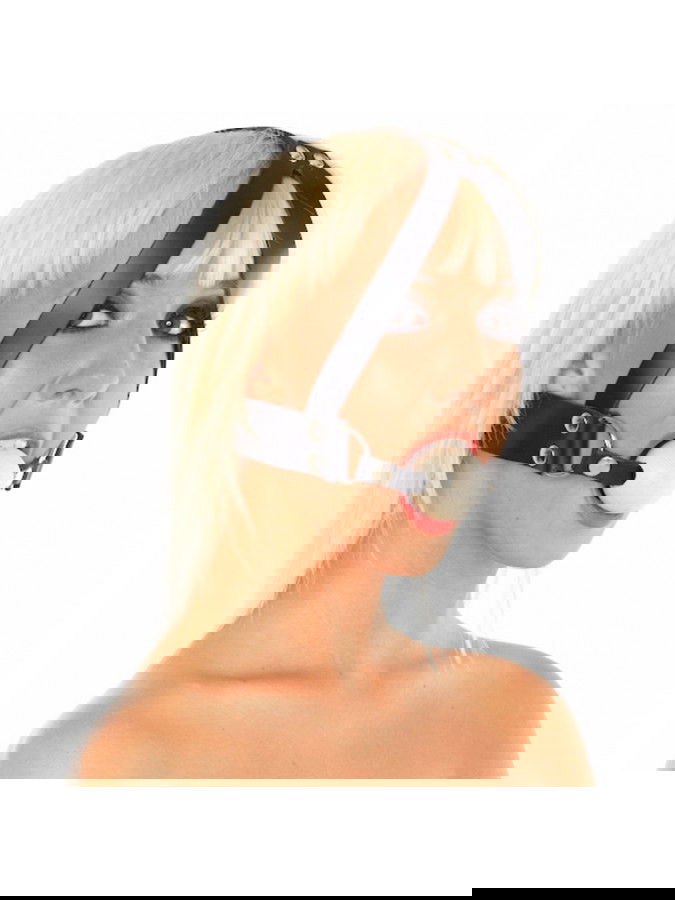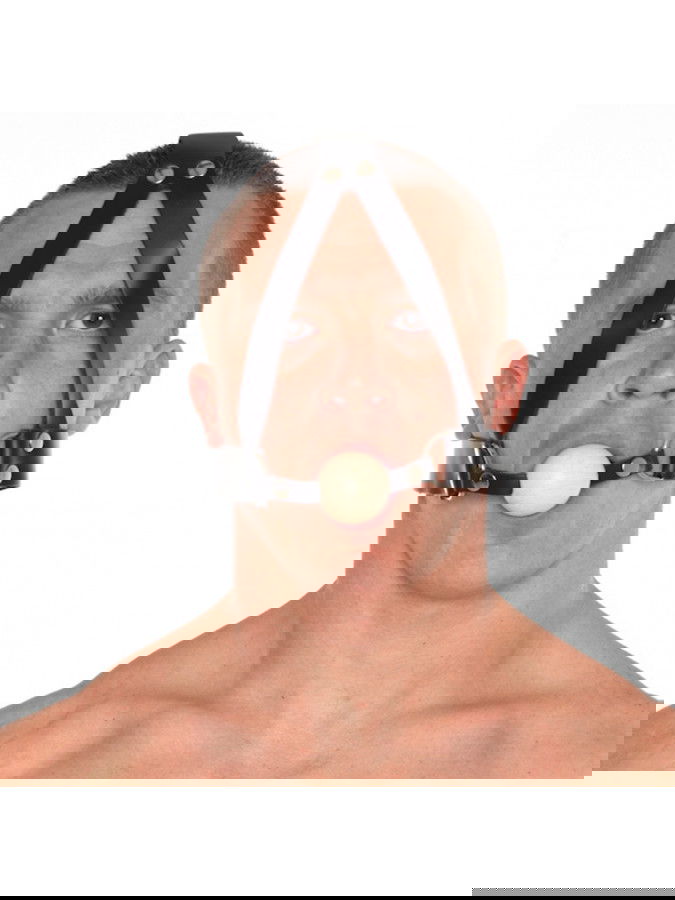 Lederen mondknevel met een massief houten bal met een doorsnede van 4 cm. De riem sluit aan de achterzijde met een stalen gesp over 8 posities. De lederen band is 3 cm breed