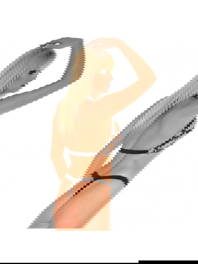 Bikini set gemaakt uit split leder en metalen ringen met elastiek aan de achterzijde. De beha is elastisch met rek van 70 tot 98 cm en de slip is rekbare van 78 tot 130 cm.