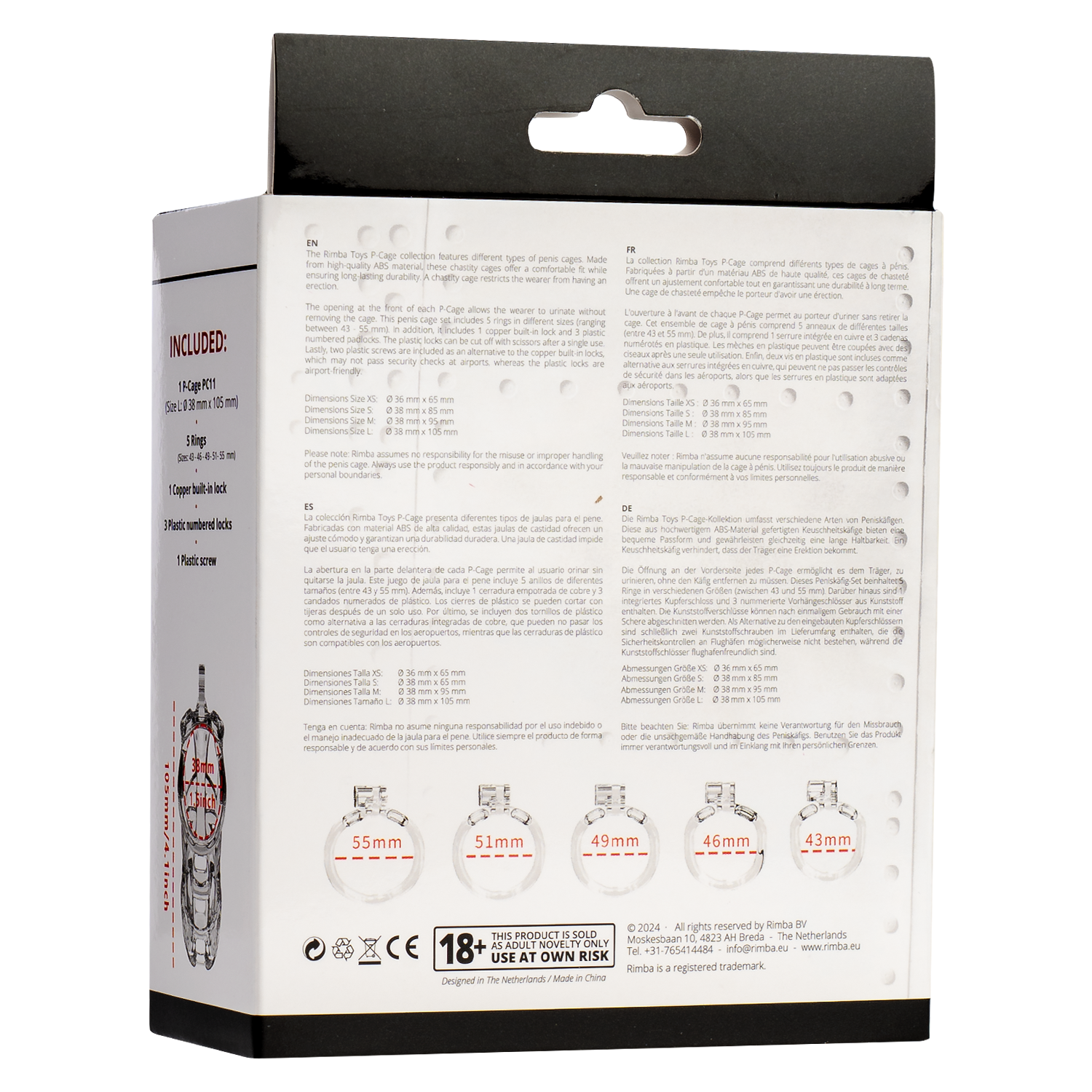 De Rimba P-Cage collectie bestaat uit verschillende soorten peniskooien. Gemaakt van ABS-materiaal van hoge kwaliteit, bieden deze kuisheidskooien een comfortabele pasvorm en een lange duurzaamheid. Een kuisheidskooi weerhoudt de drager van een erectie. Door de opening aan de voorkant van elke P-Cage kan de drager plassen zonder de kooi te verwijderen. Deze peniskooi set bevat 5 ringen in verschillende maten (variërend tussen 43 - 55 mm). Daarnaast bevat het 1 koperen inbouwslot en 3 plastic genummerde hangsloten. De plastic slotjes kunnen na eenmalig gebruik worden afgeknipt met een schaar. Tot slot wordt er één plastic schroefmeegeleverd als alternatief voor de koperen inbouwsloten, die mogelijk niet door de veiligheidscontroles op luchthavens komen, terwijl het plastic slot luchthavenvriendelijk is.