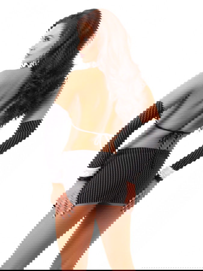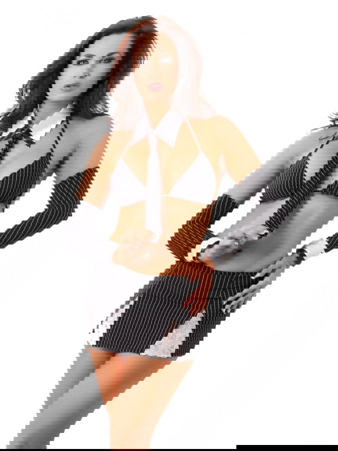 Uitdagend Secretaresse uniform. Dit kantoor outfit is een complete set inclusief mini rok, beha, handschoenen met losse polsbandjes en kraag met stropdas.